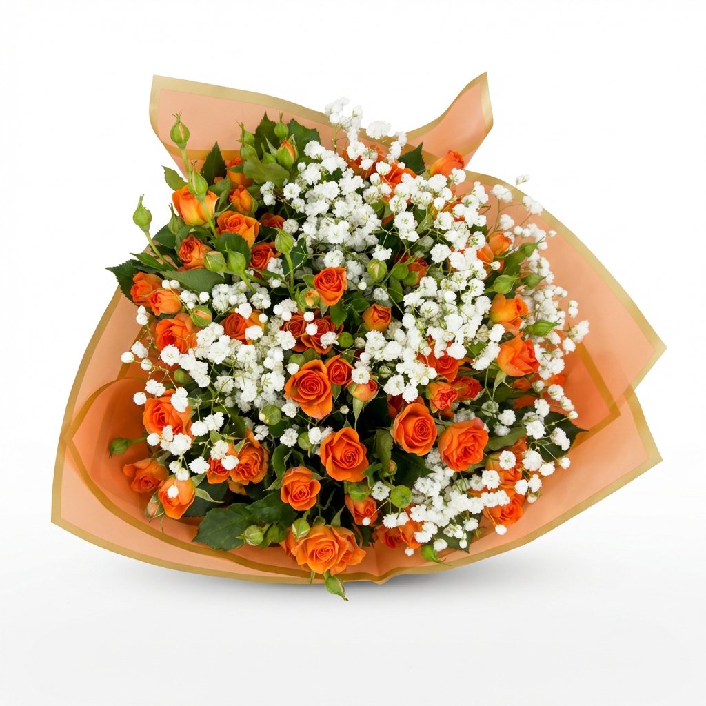 זר זריחה כתומה – זר מהודר המכיל ורד אנגלי וגיבסנית .