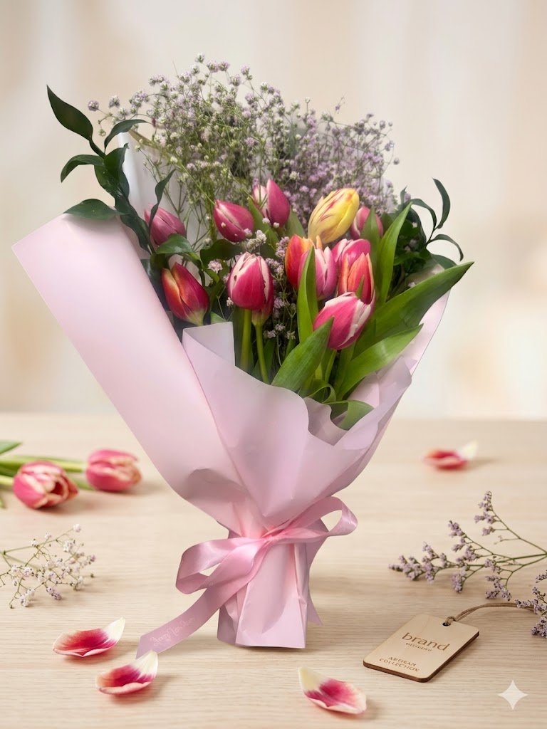 פרחי גבסנית: הילה עדינה ואווירירית של גבסנית לבנה-סגלגלה מקיפה את הטוליפים, ומעניקה לזר מראה רך, רומנטי וקסום.