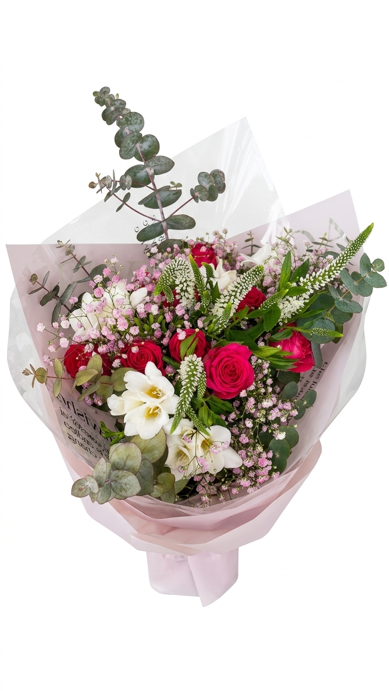 פלא טבעי של אהבה וחידוש. ורדים ורודים נועזים, פרזיות צחורות ריחניות וערפל עדין של בייבי-בראת', כולם שזורים בענפי אקליפטוס ייחודיים ומטבעיים. זר זה משלב תשוקה חמה עם רעננות אביבית, עטוף בבד ורוד יוקרתי ומעוטר בנגיעות אלגנטיות. מתנה מושלמת שתאיר כל רגע מיוחד.