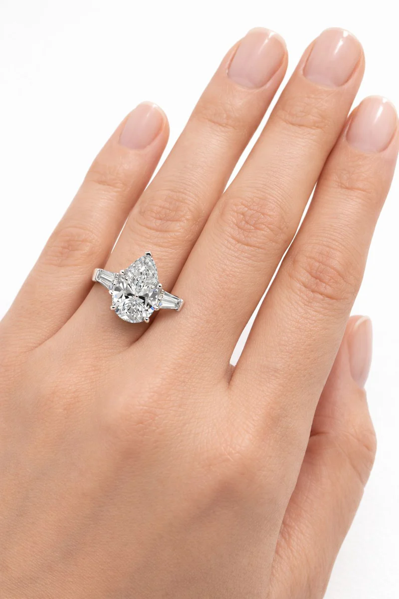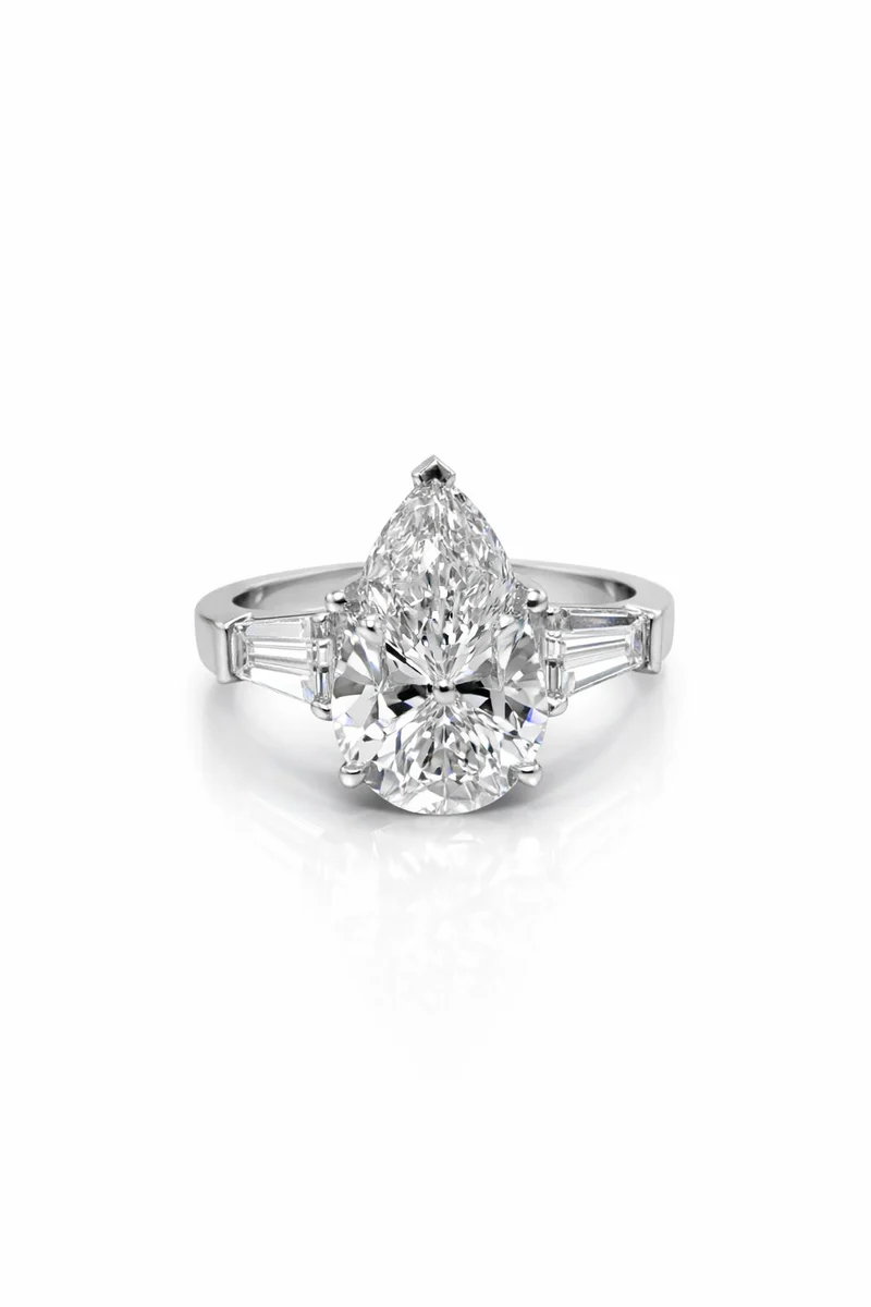 טבעת יהלום אלגנטית בזהב לבן, עם יהלום טיפה מרכזי ויהלומי צד עדינים – קלאסיקה יוקרתית ועל־זמנית