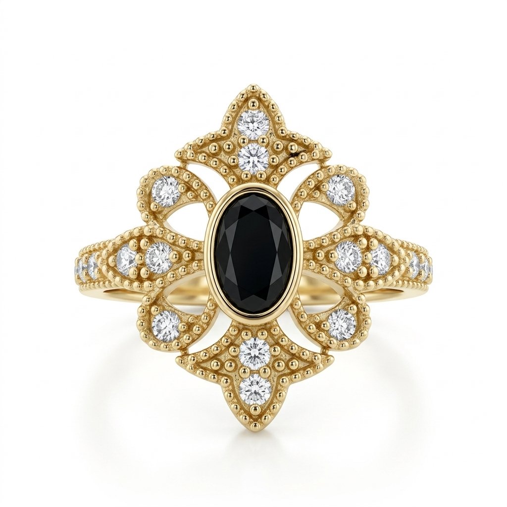 טבעת זהב צהוב 14k בסגנון וינטג׳ אלגרה. עם אבן אוניקס מרכזית שחורה ואבני זרקון.