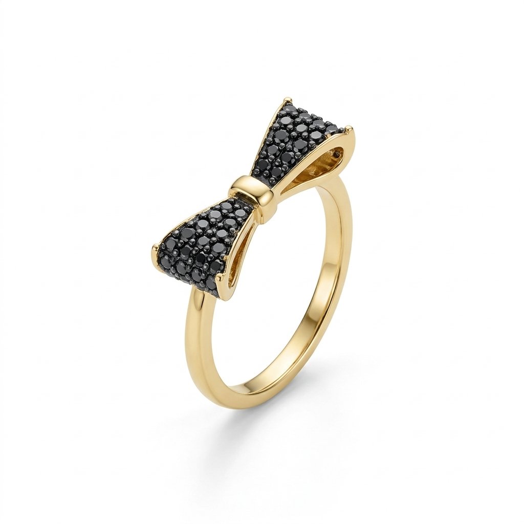 טבעת זהב צהוב 14k בצורת עניבת פרפר עם שיבוץ זרקונים שחורים
