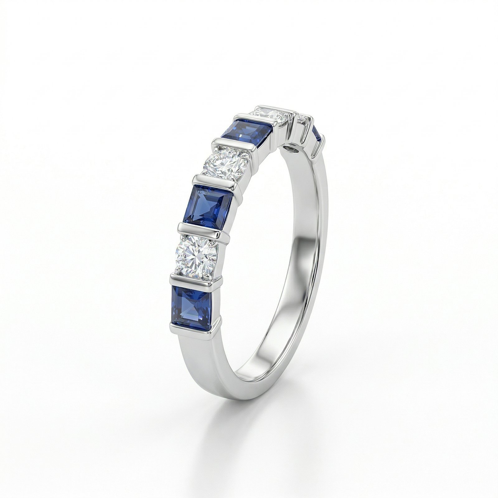 טבעת כסף 925 עם שורה של אבני זרקון עגולים ומרובעים בצבע כחול