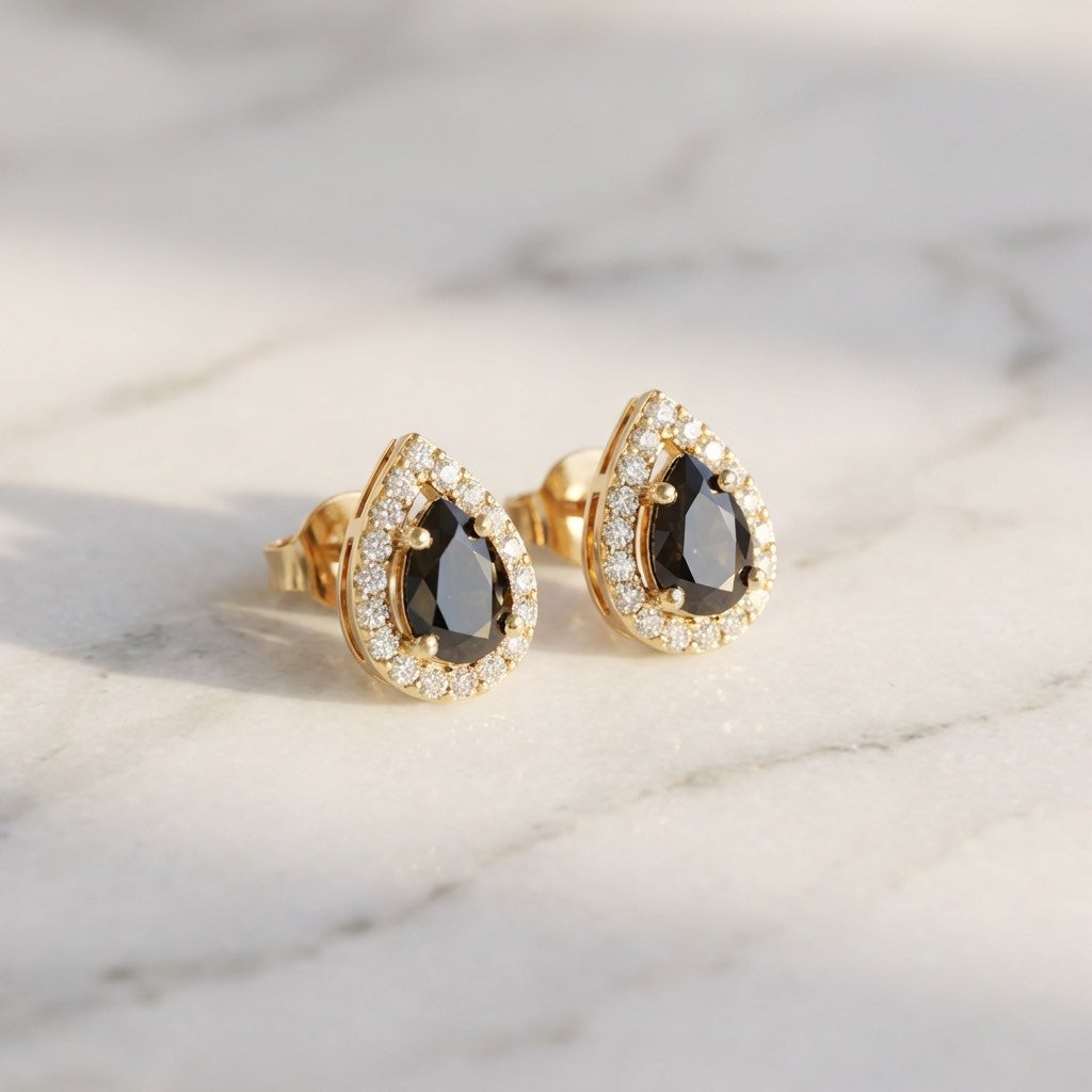 עגילי זהב 14K, בצורת טיפה משובצים באבן מרכזית שחורה ומסביבה זרקונים נוצצים. העגילים צמודים לאוזן באמצעות מוט וסגירת פרפר.