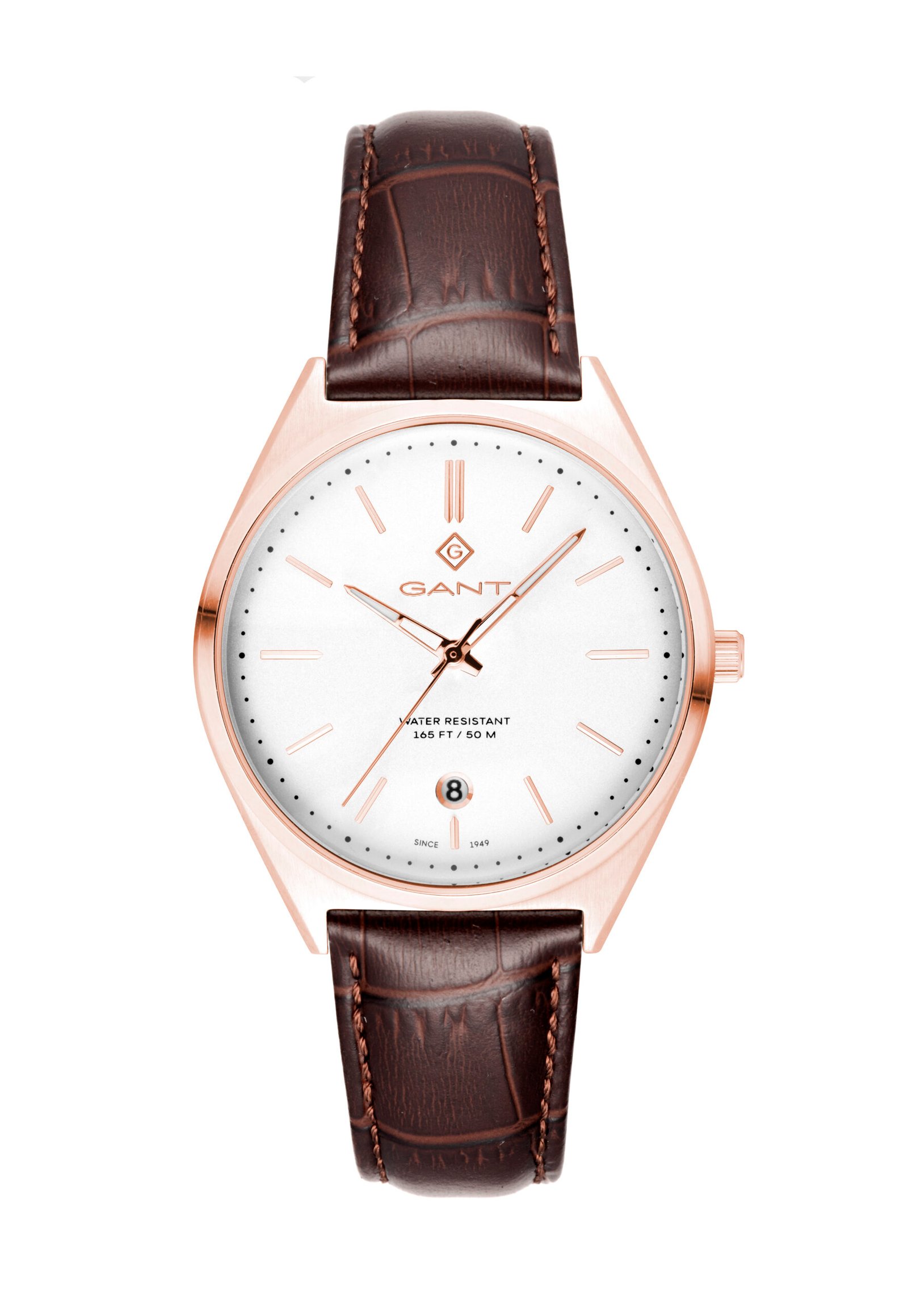 שעון גברים מבית GANT, קוטר השעון – 41 מ"מ, רצועת עור חומה יוקרתית, זכוכית השעון – קריסטל מינרלית, השעון כולל תאריכון. מנגנון קוורץ סוללה איכותי ומדוייק.  לוח לבן מסביב רוזגולד,