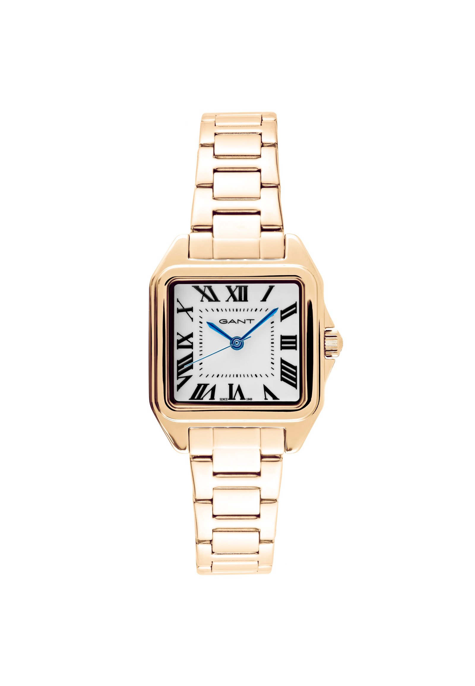 שעון נשים מבית GANT במראה עדין ויוקרתי. מרובע 26 מ"מ, זכוכית השעון – קריסטל מינרלית, מנגנון קוורץ ,רצועה זהב, לוח לבן בשילוב מחוגים כחולים וספרות רומיות בצבע שחור.