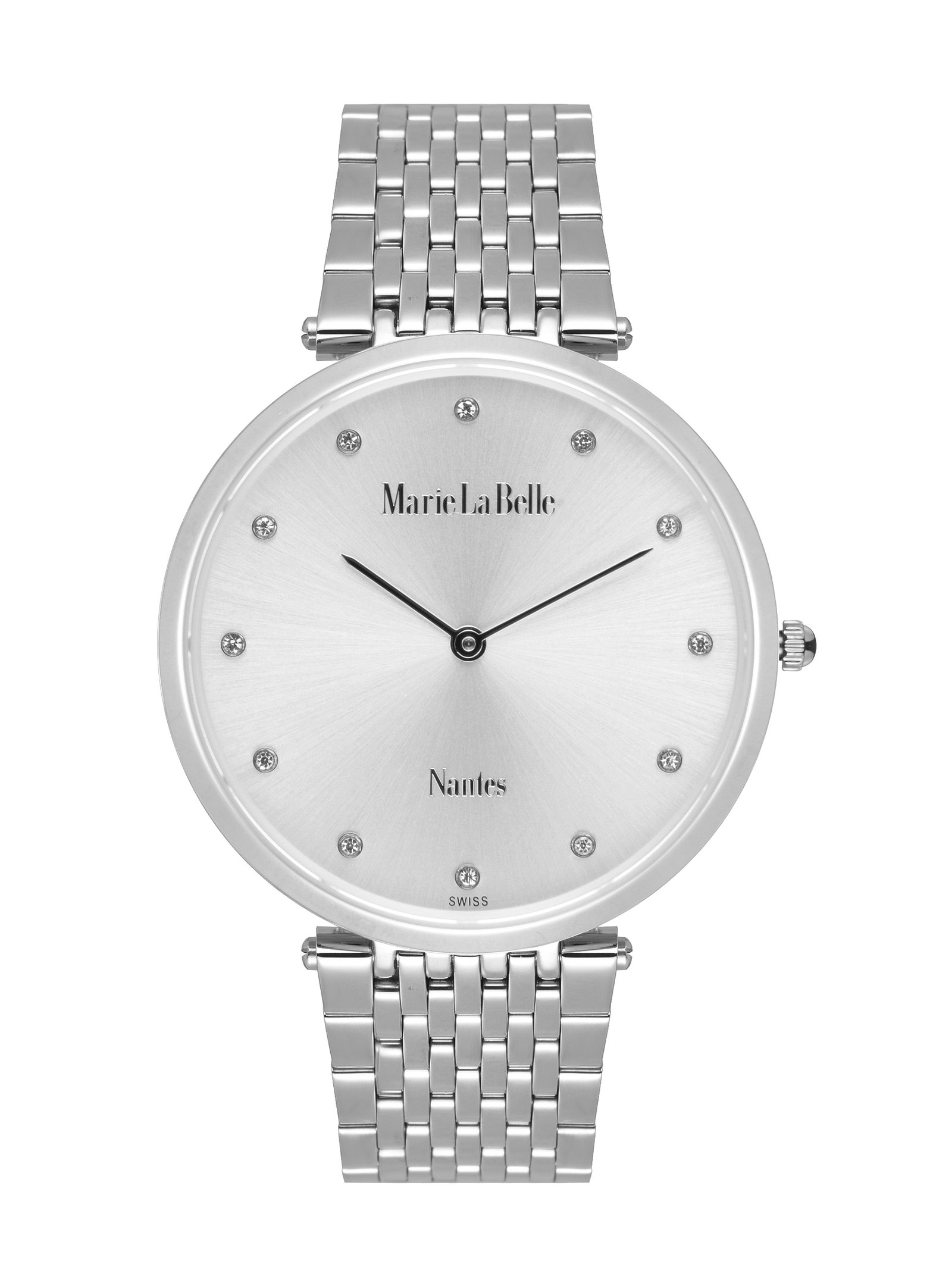 שעון לנשים מבית Marie La Belle , מסדרת Nantes . קוטר 36 מ"מ , זכוכית השעון – ספיר קריסטל , מנגנון קוורץ , שעון כסוף , לוח לבן פנינה בשילוב אלמנטים כסופים .
