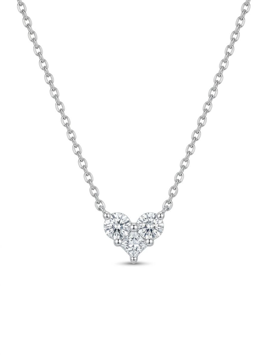 שרשרת כסף 925 בעיצוב לב משובץ שני זרקונים בחיתוך עגול וזרקון אחד בחיתוך מרובע.