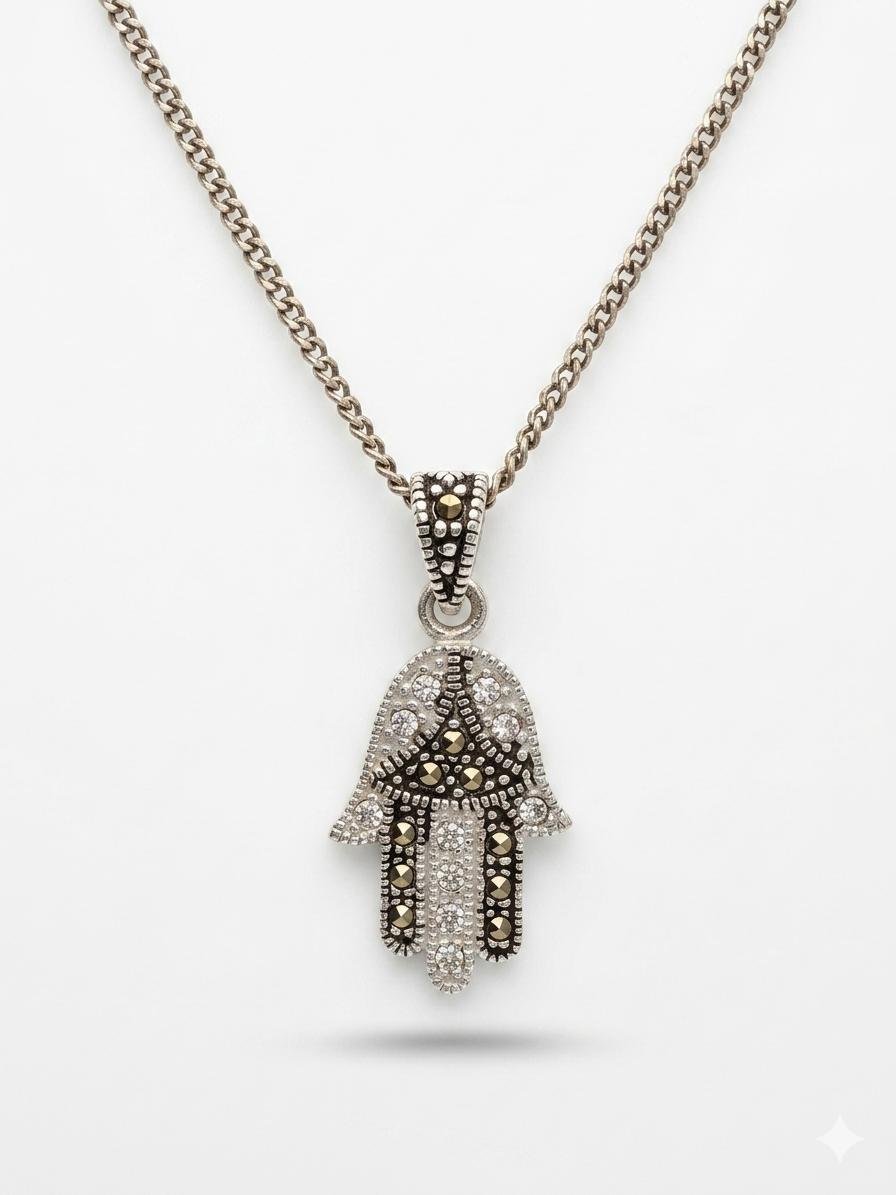 תליון כסף 925 חמסה משובץ עם אבנים לבנות ומושחרות. גודל תליון 25 מ"מ.
