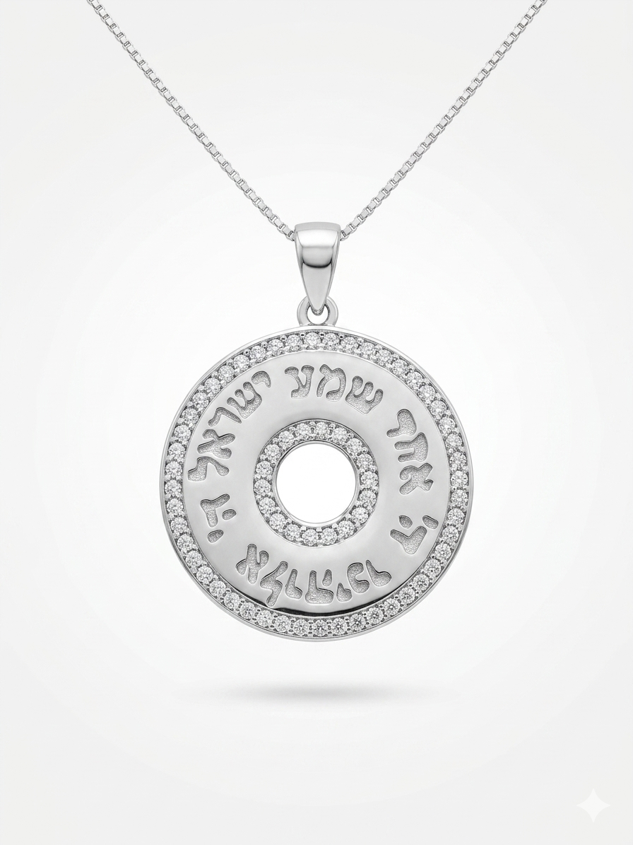 תליון כסף 925 עגול משובץ זרקונים עם הכיתוב ״שמע ישראל ה׳ אלוהינו ה׳ אחד״