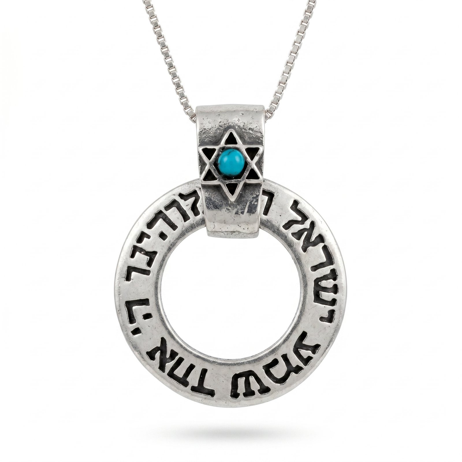 תליון כסף 925 עגול עם תנועה עם הכיתוב ״שמע ישראל ה׳ אלוהינו ה׳ אחד״